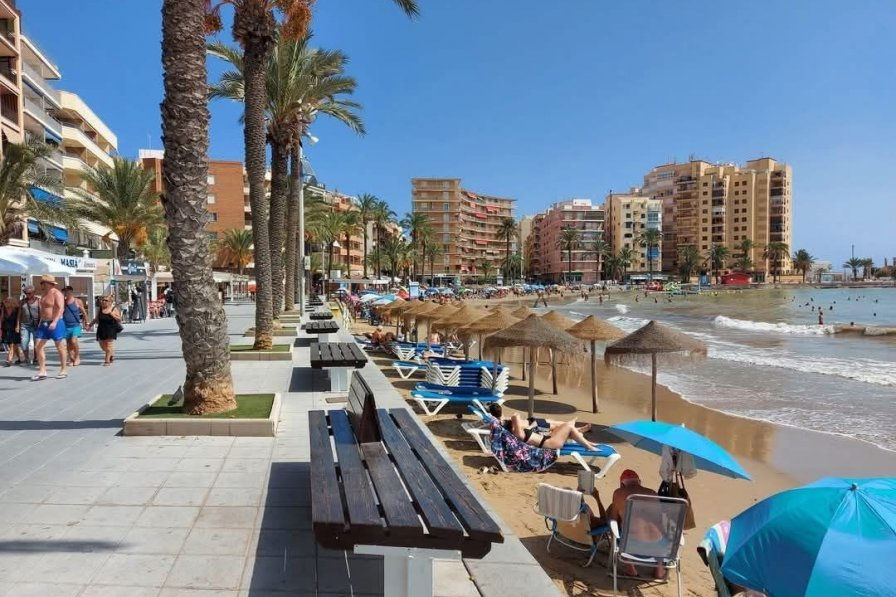 The beach and promenade are only 650 meters away, and a 24-hour corner shop is nearby. Torrevieja’s main shopping street, supermarkets, and the bus station with regular services to Alicante Airport are all close by. Alicante Airport is about 40 km away, a 40-minute drive.